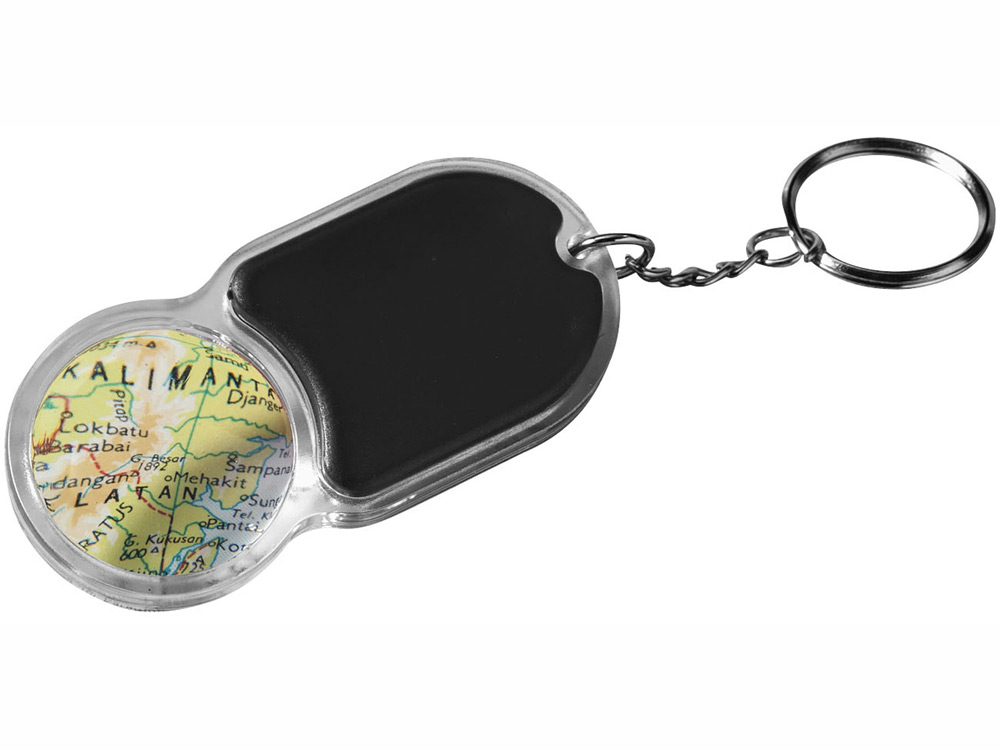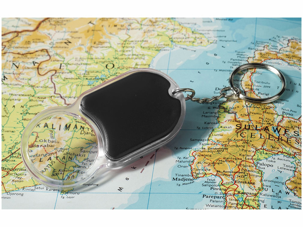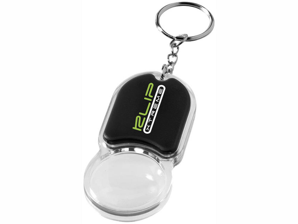 Удобный брелок с увеличительным стеклом и фонариком для ключей с выключателем на задней стороне. Металлическое кольцо для ключей Ø 25 мм.
