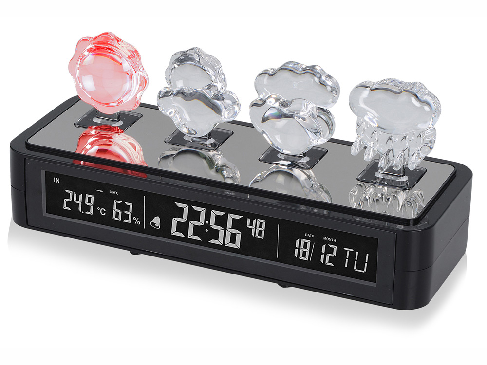 Метеостанция совмещает в себе функцию часов с будильником, календарь, гигрометр и термометр. Оригинальное оформление и подсветка наглядно показывают погоду за окном. Отличный подарок, который не останется без должного внимания.