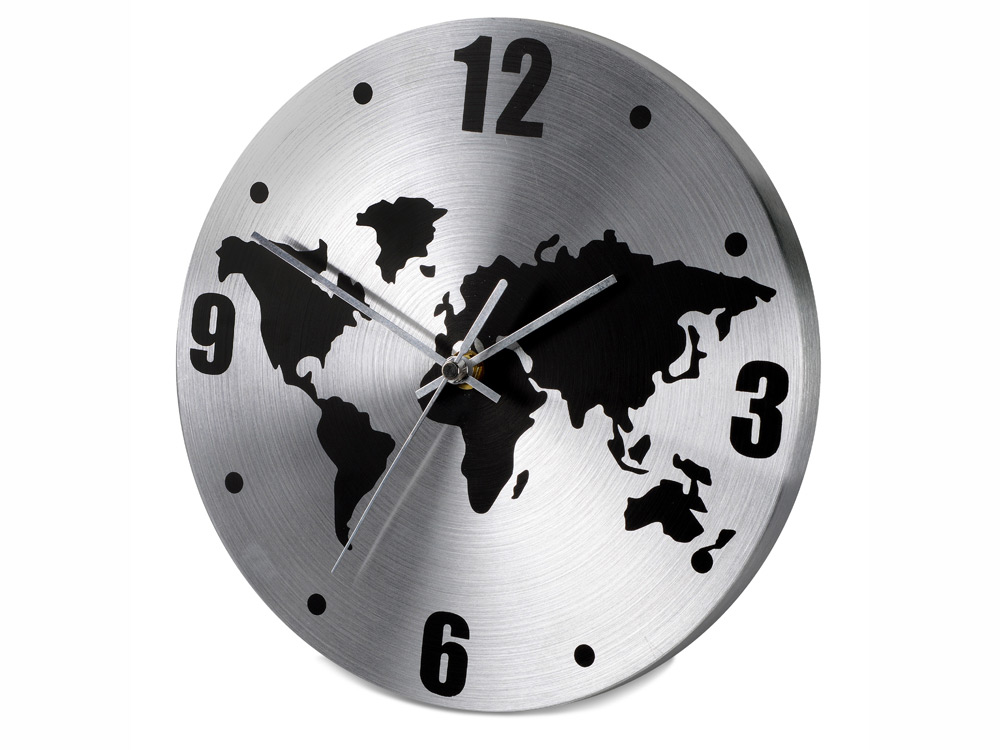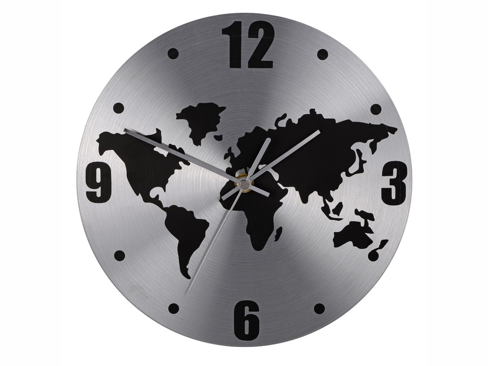 Настенные часы с картой мира на циферблате имеют необычный дизайн и контрастное сочетание цветов. На часы можно нанести логотип и наименование организации.