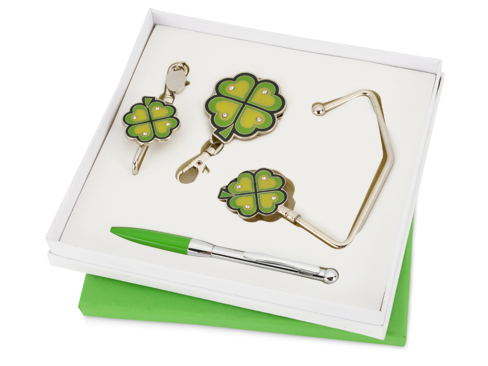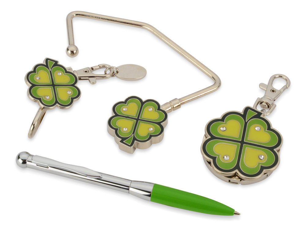 Оригинальный набор с изображением четырехлистного клевера принесет удачу и станет приятным подарком для милых дам. Набор состоит из удобной шариковой ручки, складного и обычного крючка для сумки, крючка для ключей.
