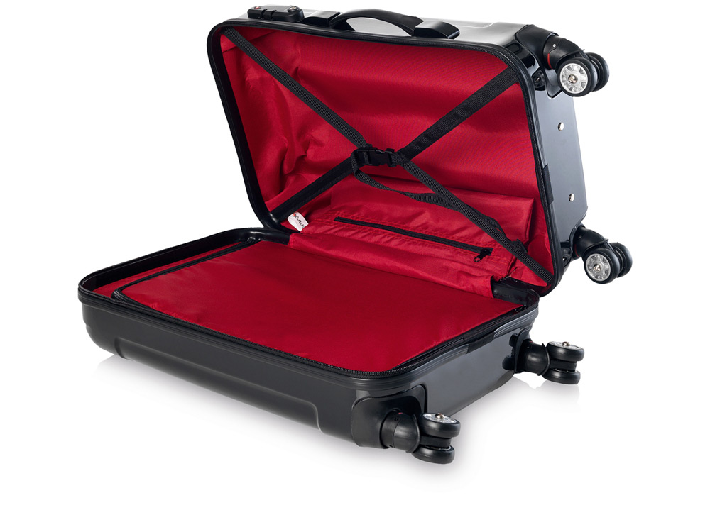 Чемодан на колесиках Ride прекрасно подходит для деловых поездок. Ваши вещи будут защищены не только молнией, но и замком, ключи к которому изготовлены индивидуально.