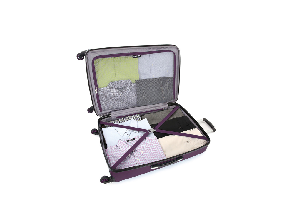 Корпус чемодана выполнен из износоустойчивого АБС-пластика. Два больших отделения помогут максимально удобно разместить вещи: одно отделение фиксируется молнией, а второе специальным ремнями для одежды. Вместительность чемодана может быть дополнительно увеличена на 5см. Чемодан легко перемещается при помощи четырех колес вращающихся на 360 градусов и выдвижной ручки с фиксатором. Эргономичные ручки для переноски облегчат его поднятие.