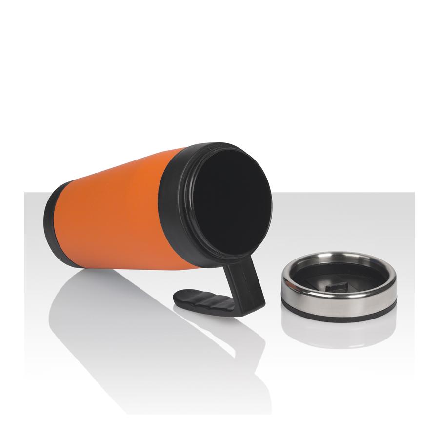 Внешняя стенка термокружки изготовлена из нержавеющей стали с уникальным прорезиненным напылением soft-touch , а внутренняя ее стенка выполнена из высококачественного пластика. Крышка оснащена удобным клапаном для питья. Стильная форма, универсальный объем, удобная ручка – все это прекрасно сочетается между собой и делает кружку еще привлекательнее.