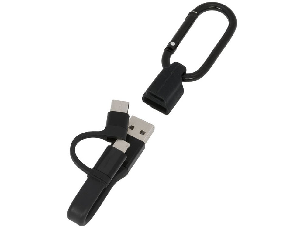 Кабель для зарядки Fold «3-в-1» с карабином. Кабель для зарядки Fold «3-в-1» с карабином включает кабель USB A, кабель с интегрированным разъемом «2-в-1» для зарядки устройств Android и iOS и кабель с разъемом Type C. Кабели можно сложить в слоты. Он также включает карабин для удобного крепления. Пригоден только для зарядки. АБС-пластик.