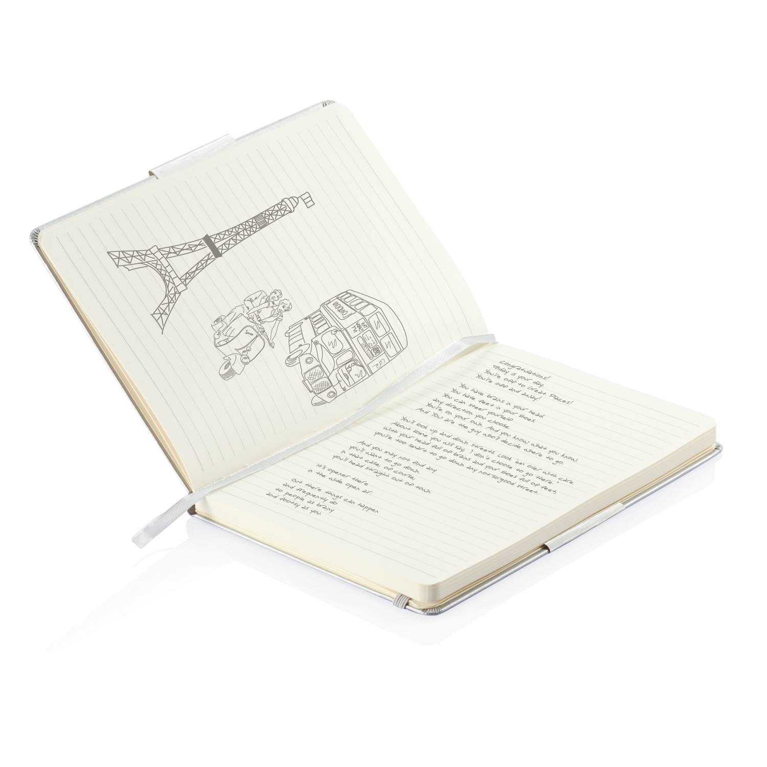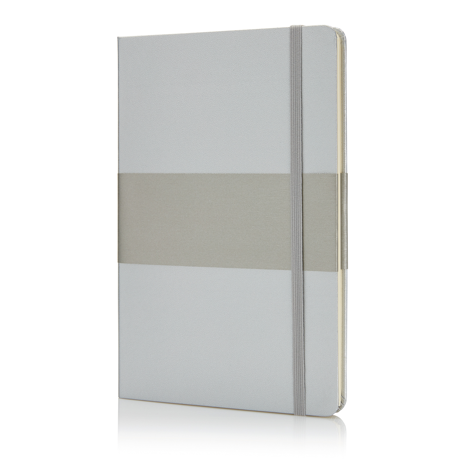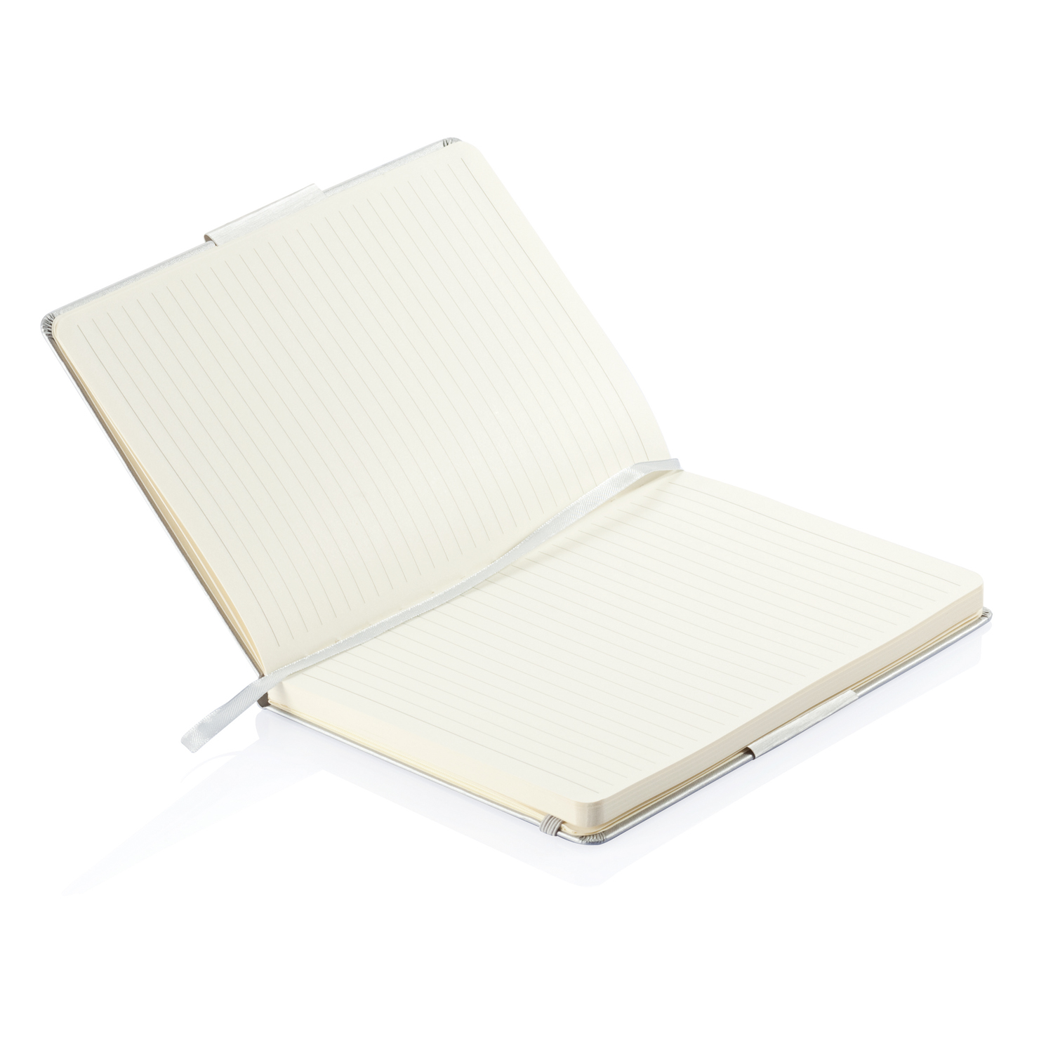 Блокнот в твердой обложке формата A5 с фиксирующей резинкой. Обложка из дизайнерской бумаги со скругленными углами, 80 листов из бумаги желтого цвета, 80 г/м2.