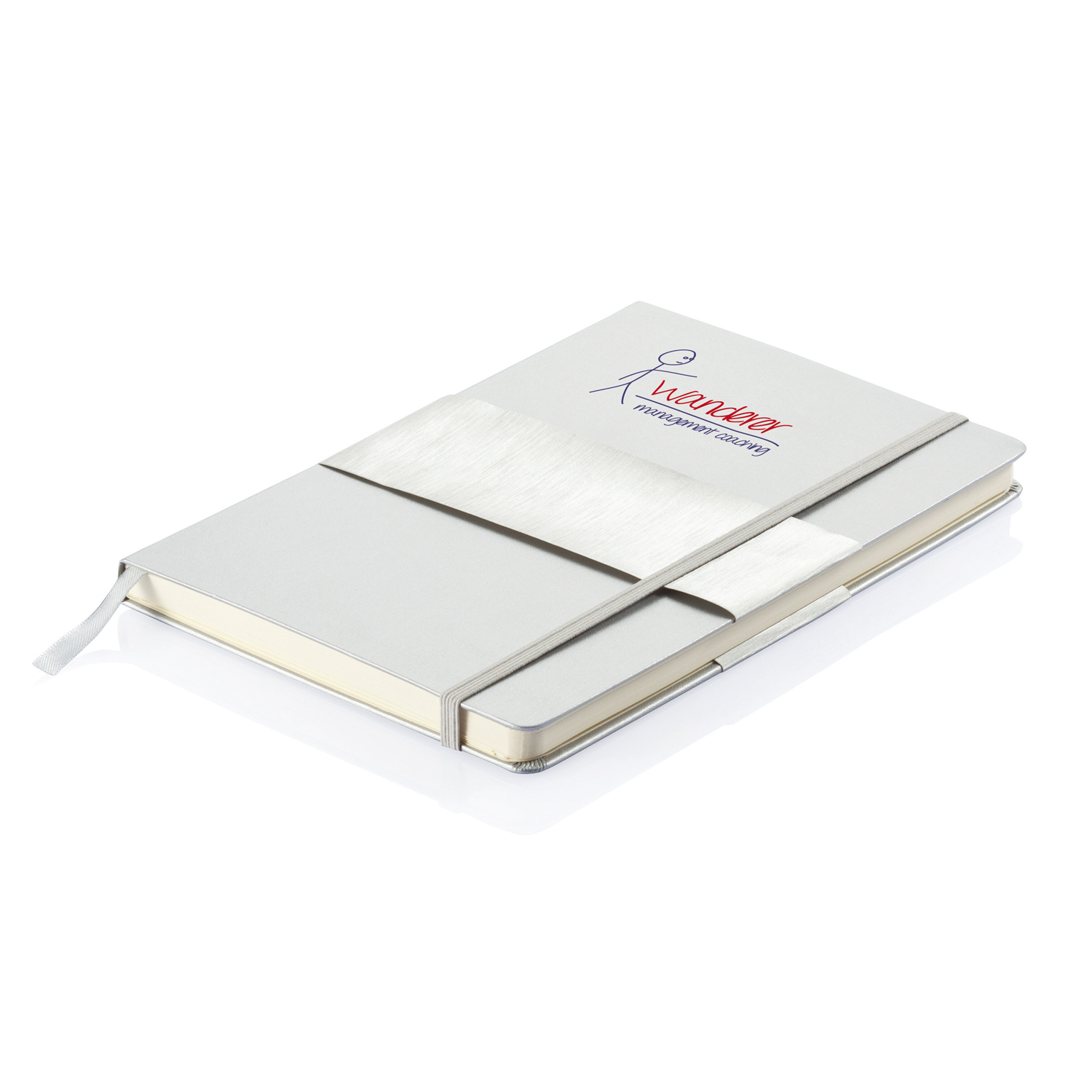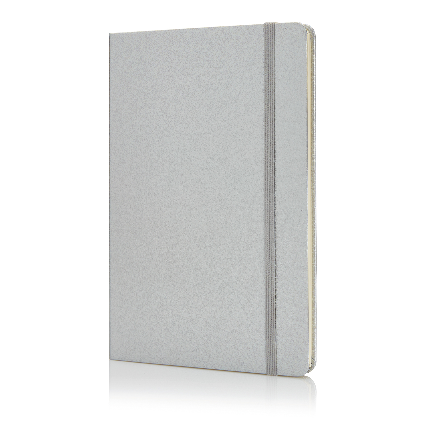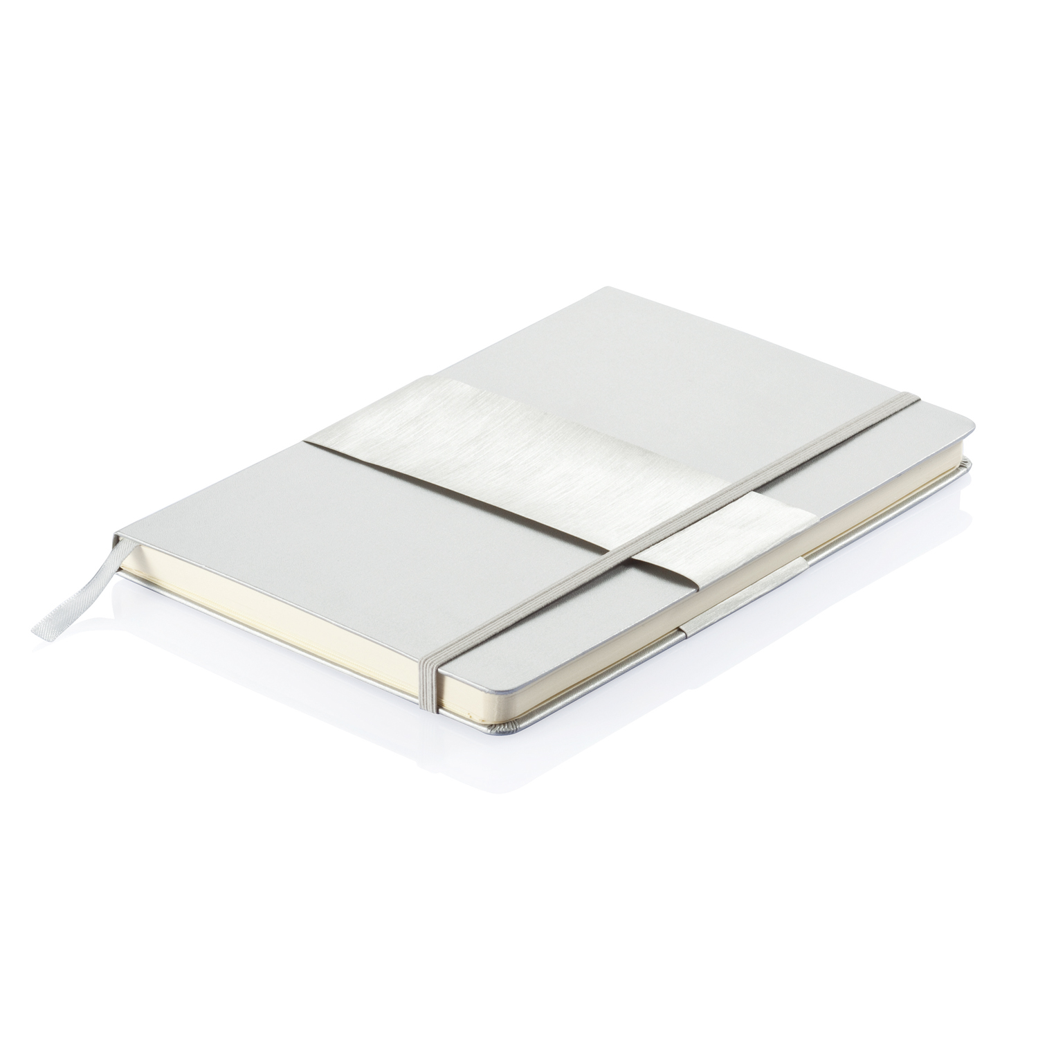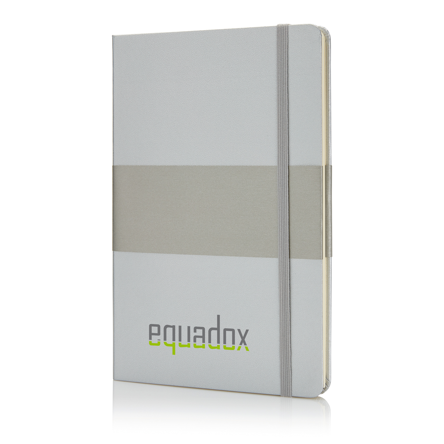 Блокнот в твердой обложке формата A5 с фиксирующей резинкой. Обложка из дизайнерской бумаги со скругленными углами, 80 листов из бумаги желтого цвета, 80 г/м2.