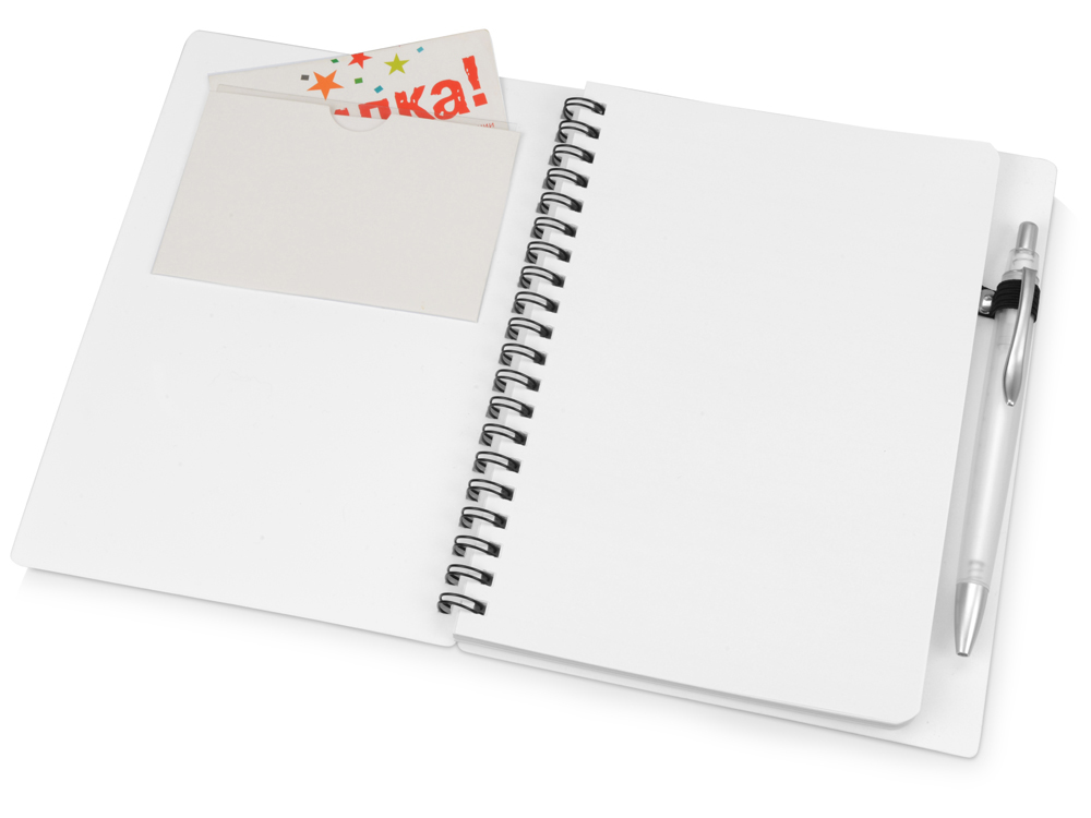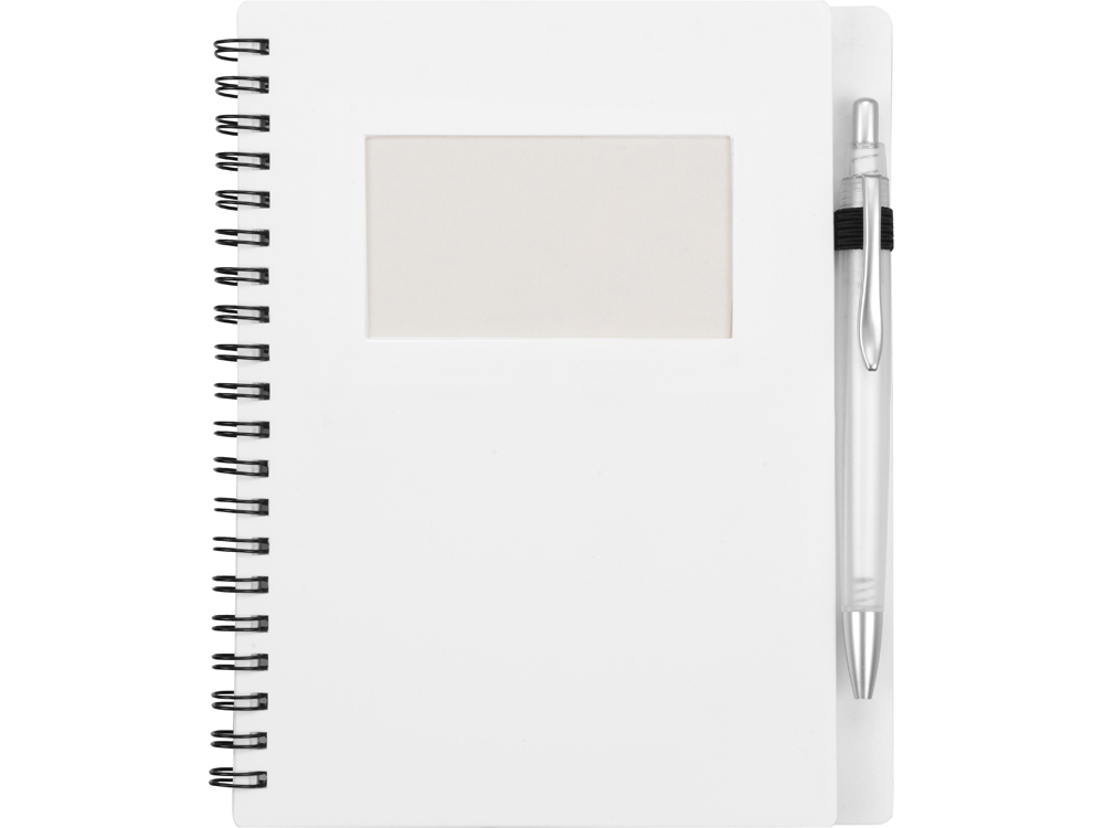 Блокнот «Контакт» в полипропиленовой обложке переплетен на пружине. В обложке блокнота предусмотрено окошко, в которое можно поместить визитную карточку или полиграфическую вставку. В комплекте с блокнотом идет ручка, которая вставляется в петельку сбоку.
