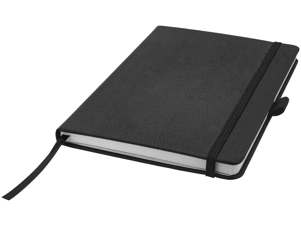 Блокнот Wood-look. Красивый блокнот с обложкой "под дерево" для тиснения вашего лого или месседжа. 80 листов линованной кремовой бумаги (80 г). Резинка в цвет, закладка, петелька для ручки и внутренний кармашек для заметок. Упакован в черную коробку. Термополиуретан.