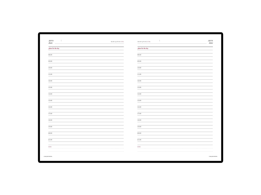 Твердая обложка со слегка закругленными уголками выполнена из гладкого переплетного материала с приятной на ощупь поверхностью soft-touch. По контуру обложки проходит строчка, делающая акцент на форме ежедневника. Благодаря внутреннему набивному слою обложка выглядит объемнее и привлекательнее.