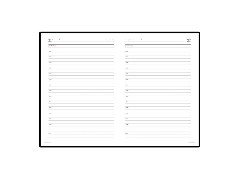 Две строчки на каждой странице отведены на ежедневное планирование. Есть почасовая разбивка страниц. Две последние строчки служат для комментариев. Строгий классический материал, прекрасная практичная альтернатива дорогостоящей натуральной коже. Идеально сочетается с тиснением фольгой.