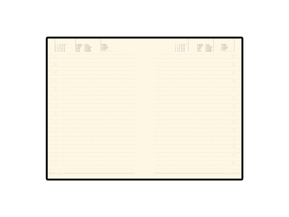 Недатированный ежедневник формата А5 соответствует размеру 142 х 215 мм.