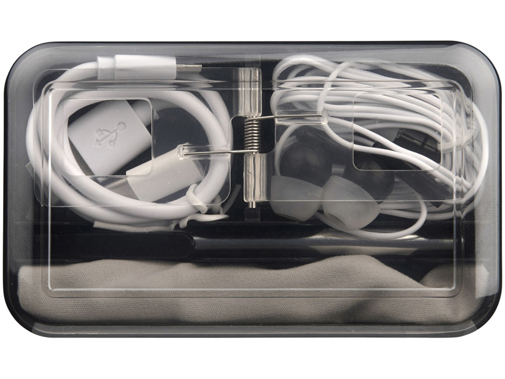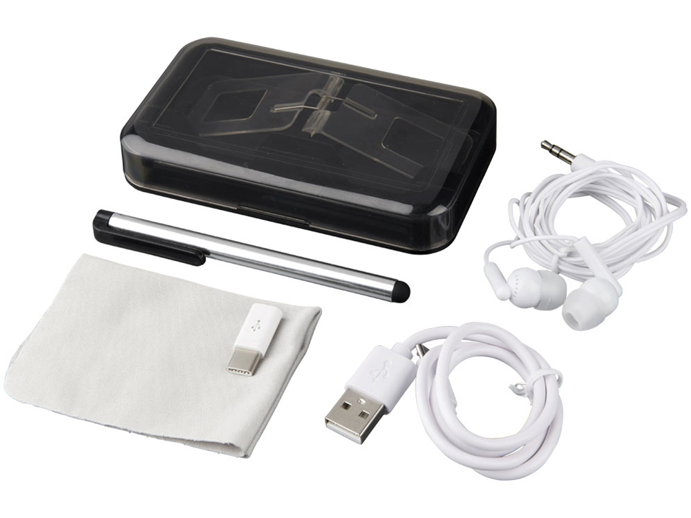 Дорожный набор. Дорожный набор содержит все необходимое для телефона в дороге. В набор входят наушники, зарядный кабель Micro USB, стилус, салфетка из микрофибры, адаптер типа C, а также чехол для хранения и украшения телефона. ABS пластик.