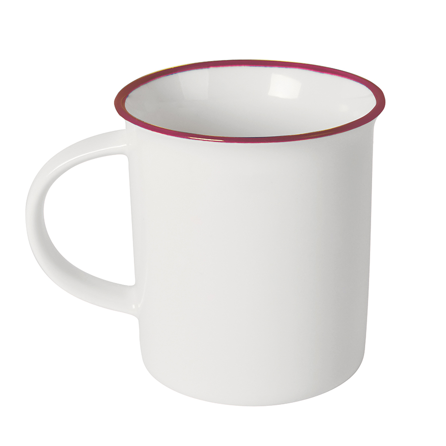 Белое глянцевое покрытие дополняет цветной кант по краю кружки.