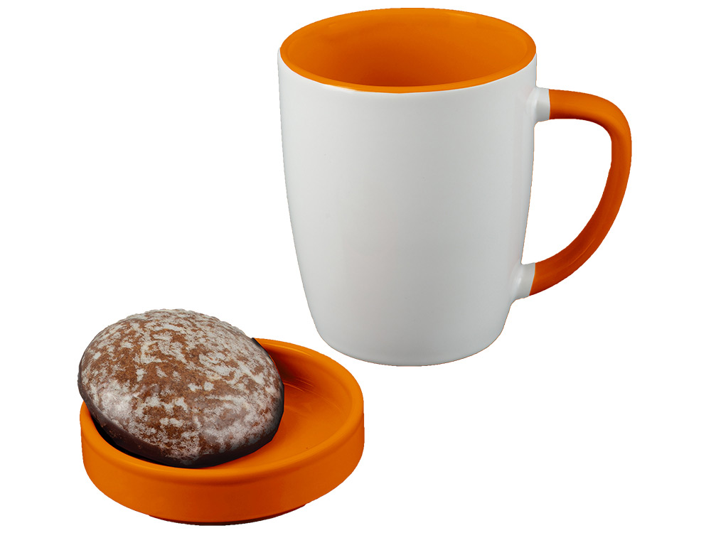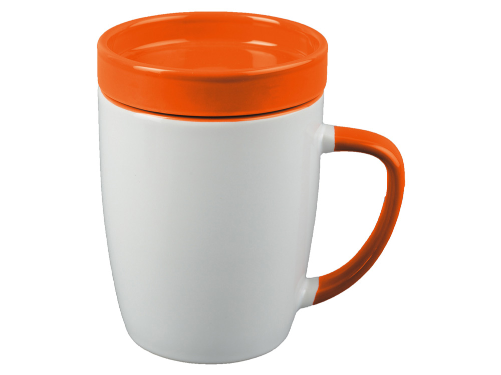 Белая керамическая кружка на 320 мл с яркого цвета ручкой - отличная основа под нанесение символики компании. В комплекте с кружкой идет крышка под цвет ручки, играющая также роль подставки и даже блюдца.