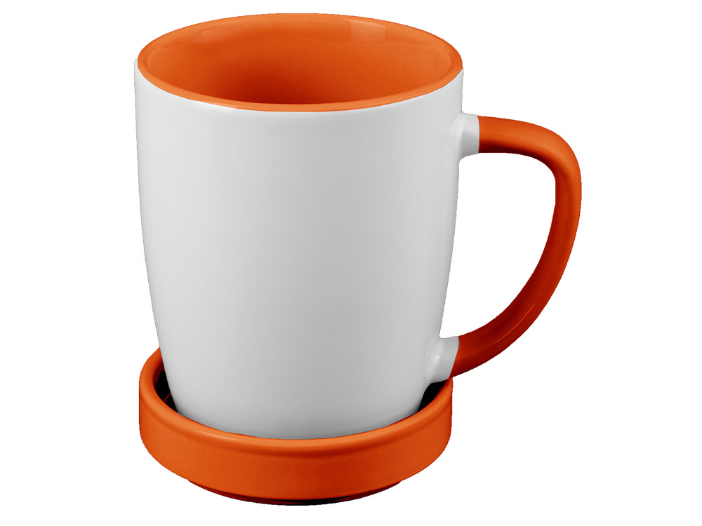 Белая керамическая кружка на 320 мл с яркого цвета ручкой - отличная основа под нанесение символики компании. В комплекте с кружкой идет крышка под цвет ручки, играющая также роль подставки и даже блюдца.