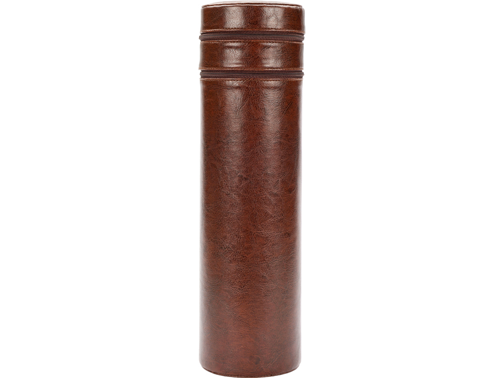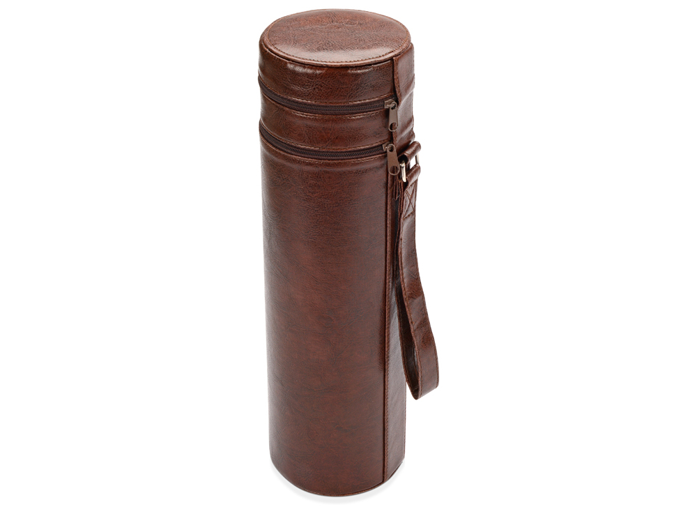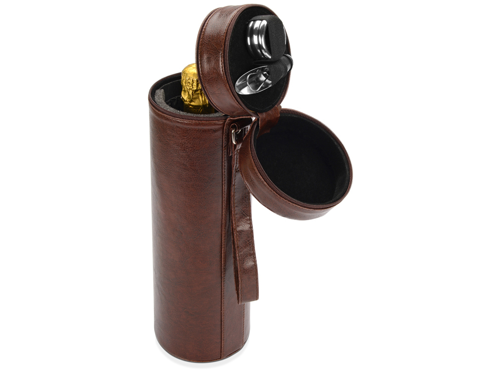 Стильный тубус для бутылки с дополнительным помещением под аксессуары для вина станет превосходным и необычным подарком. Набор позволит аккуратно манипулировать с вином в природных условиях.