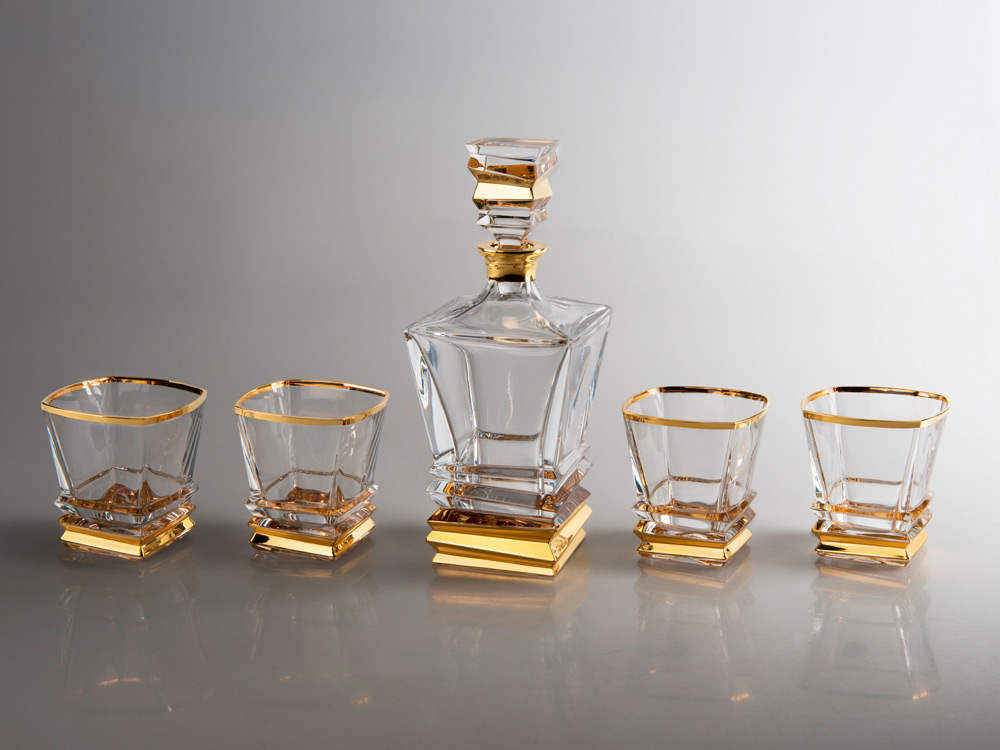 Стильный набор для виски состоит из графина и 4-х бокалов. Набор сделан из высококачественного прозрачного хрусталя и задекорирован золотистым напылением. Необычная форма стаканов и графина непременно понравится будущим владельцам.