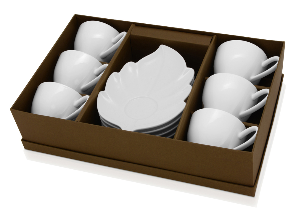 Замечательный набор из 6 чашек емкостью 180 мл с блюдцами в форме листьев напомнит о ярких красках осеннего леса и позволит насладиться ароматным напитком. Белая фарфоровая поверхность набора дает возможность придумать свой эксклюзивный дизайн.