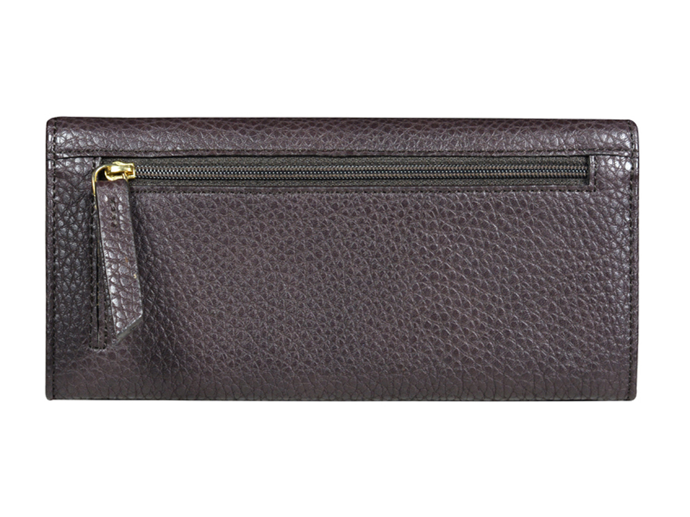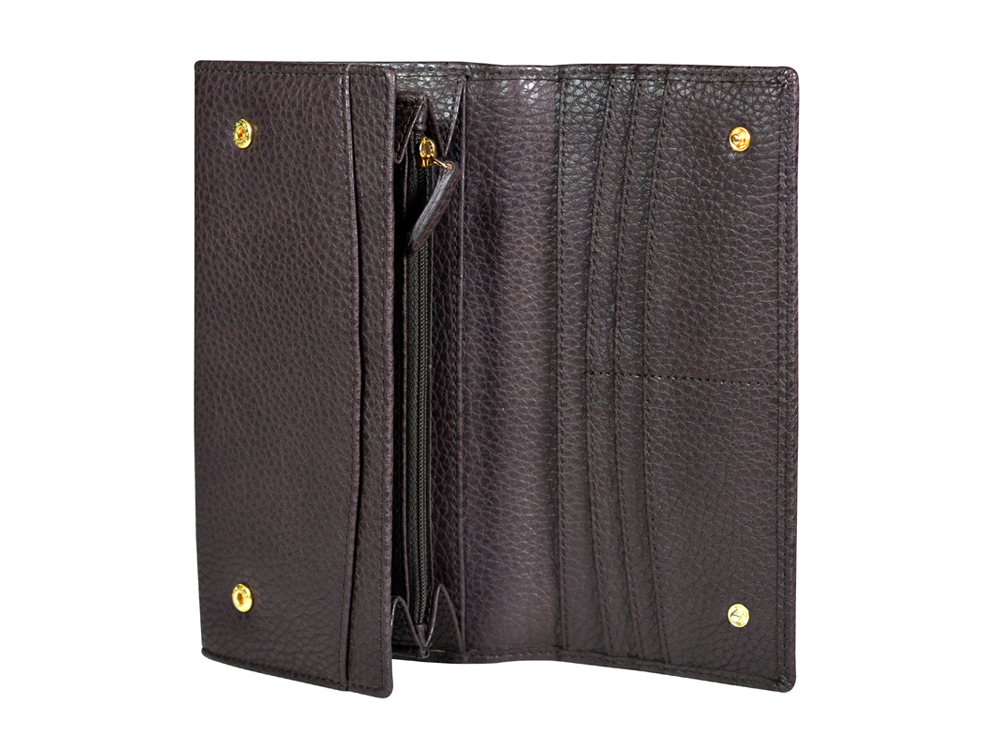 Кошелек закрывается на две кнопки, включает в себя: два отделения для купюр, одно отделение на молнии, восемнадцать отделений для кредитных карт, два универсальных кармана, один скрытый карман. С оборотной стороны кошелька есть универсальное отделение на молнии.