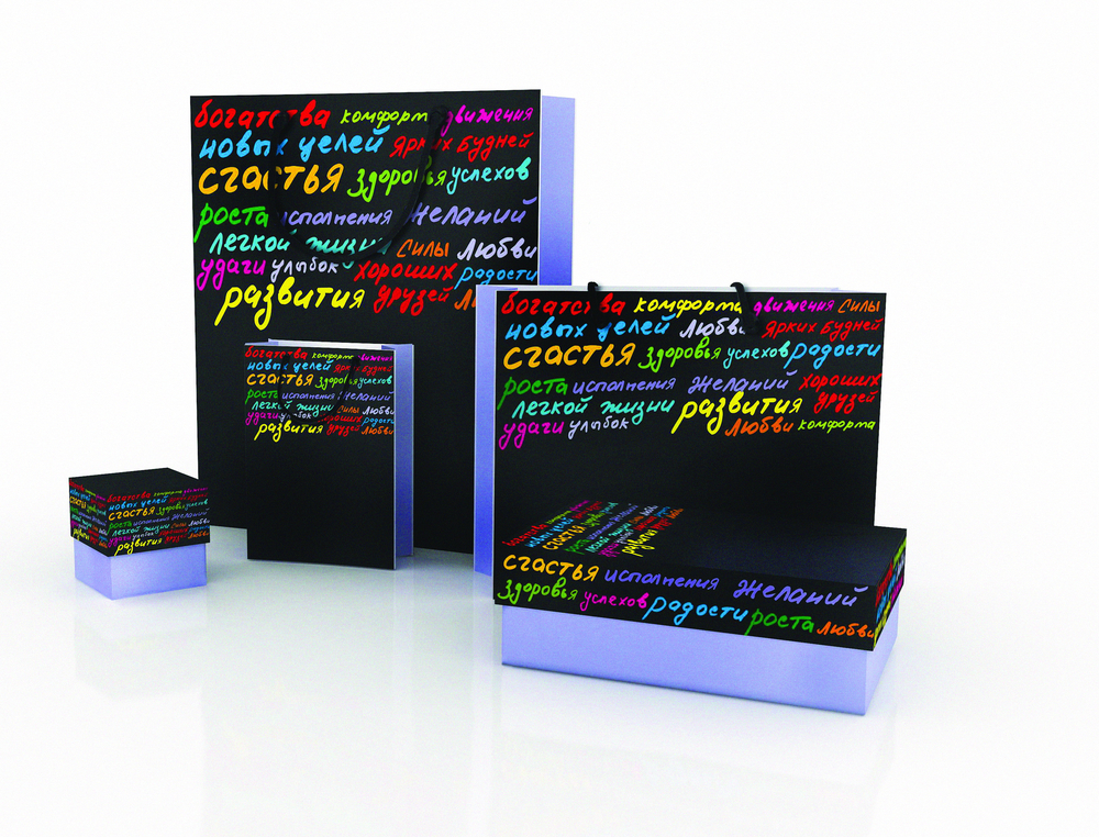 Подарочные совмещают в себе функции упаковки и открытки: на них уже написаны всевозможные пожелания. Для этой серии, выпущенной небольшим тиражом, специально разработан авторский дизайн. Пакеты и коробки отпечатаны с применением лучших полиграфических технологий и заламинированы. На свободном от декора черном поле можно разместить логотип компании, текст или рисунок.Возможные способы и стоимость нанесения логотипа предоставляются по запросу.