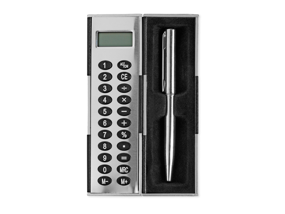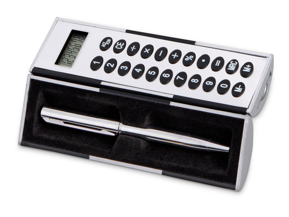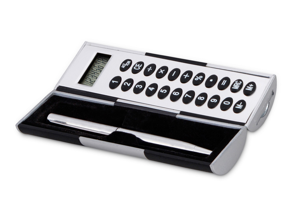 Калькулятор – футляр для ручки можно смело назвать магическим. Почему? Да потому что две его половинки вращаются на 360 градусов – одна вокруг другой, что очень удобно, ведь всегда можно удобно расположить и зафиксировать калькулятор перед собой. В комплект также входит шариковая ручка.