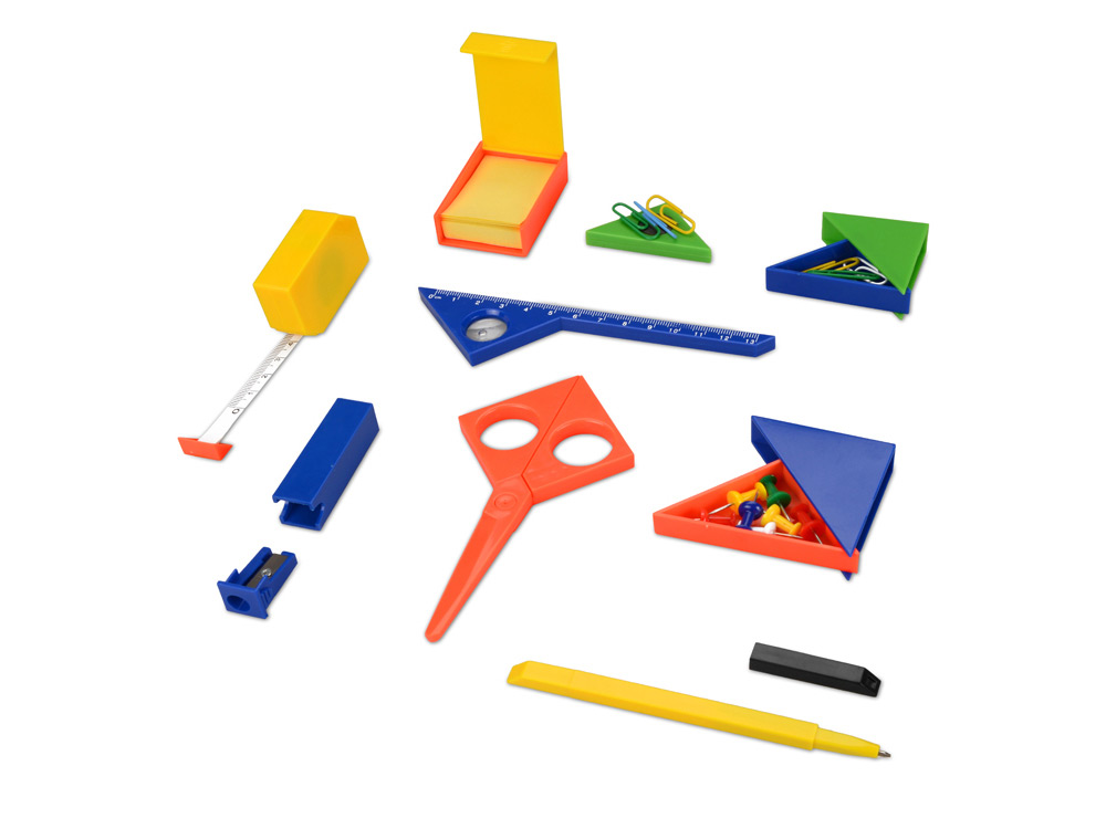 Яркий набор канцелярских принадлежностей поможет разнообразить течение офисных будней! Прекрасный подарок молодым и креативным специалистам. В компактном футляре собраны такие необходимые принадлежности как рулетка на 1 м, точилка, ножницы, шариковая ручка, линейка с лупой, держатель, скрепки, кнопки, бумажный блок.