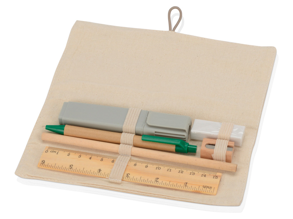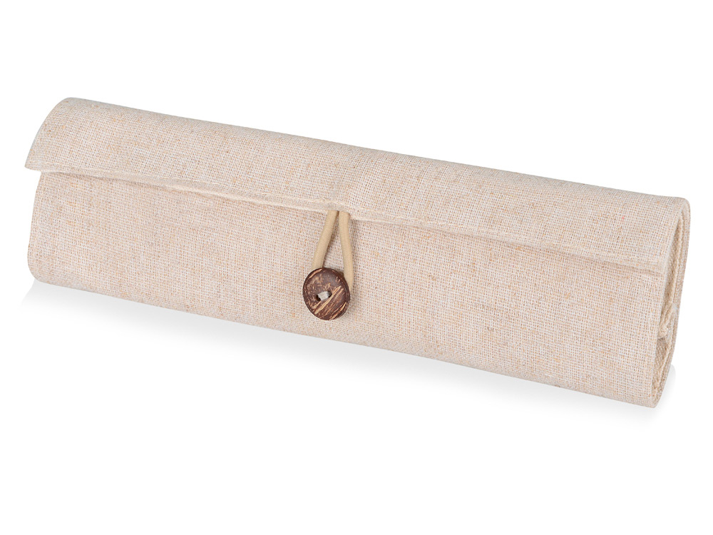 Стильный пенал в этническом стиле прекрасно подойдем специалистам творческих профессий. Льняная основа пенала украшена крупной деревянной застежкой в виде пуговицы. В набор входят ручка, карандаш, маркер из переработанного пластика, линейка, точилка, ластик.