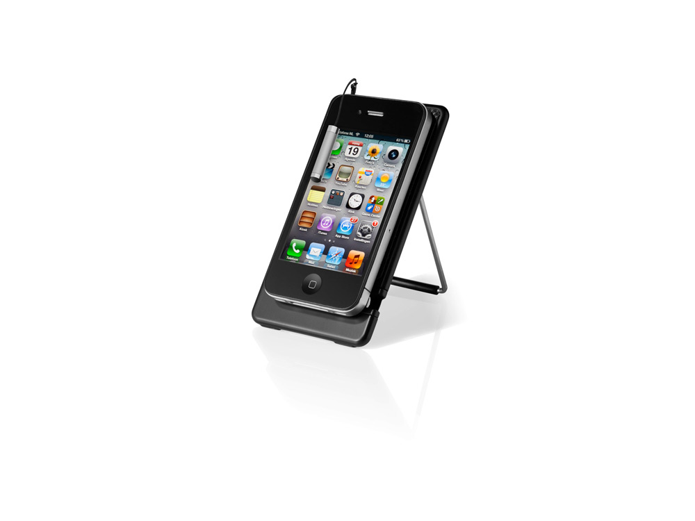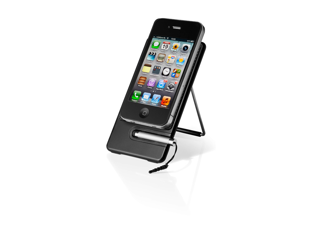 Компактная подставка для мобильного телефона снабжена специальным стилусом. Подставка имеет удобный наклон, благодаря которому телефоном можно пользоваться даже не беря в руки.