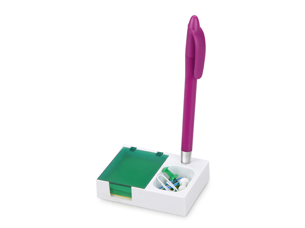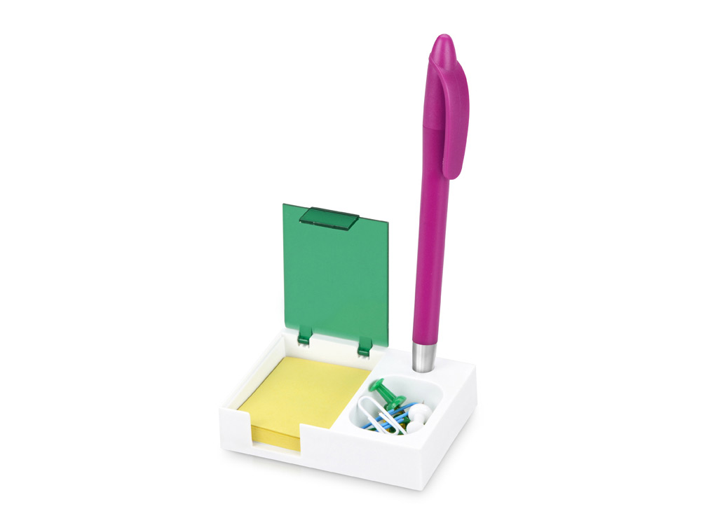 Яркая и удобная поставка под ручку, канцелярские скрепки и бумажный блок превосходно организует ваше рабочее место. Отличный подарок при проведении промо-акций.