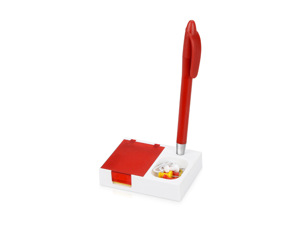 Яркая и удобная поставка под ручку, канцелярские скрепки и бумажный блок превосходно организует ваше рабочее место. Отличный подарок при проведении промо-акций.