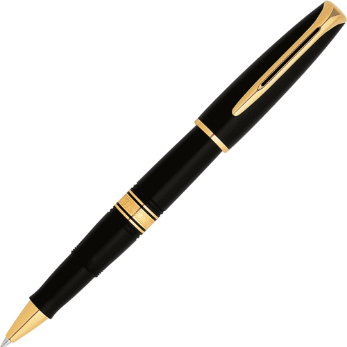 Роллерная ручка Waterman Charlestone Ebony Black GT. Корпус и колпачок - акриловая смола, детали дизайна - позолота 23К, линия письма - тонкая