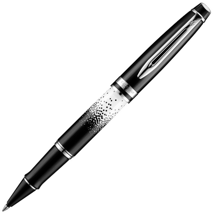 Роллерная ручка Waterman Expert Ombres & Lumieres CT. Корпус и колпачок - белый лак с отделкой черной шелкографией, детали дизайна с никеле-палладиевым покрытием, линия письма - тонкая