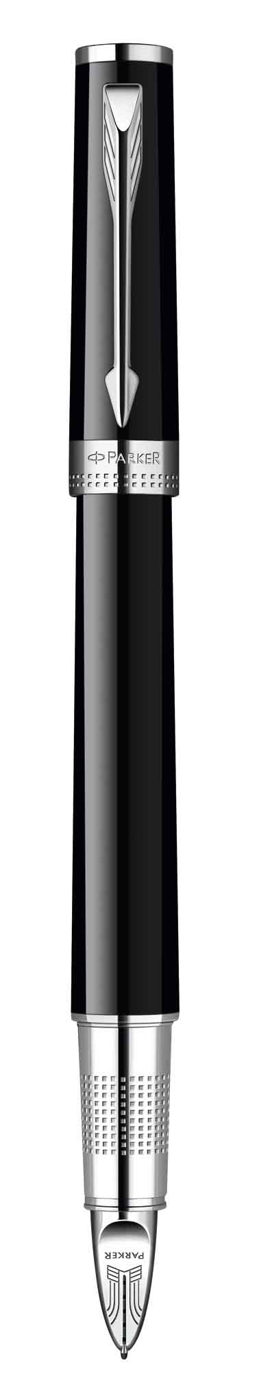 Ручка Пятый пишущий узел Parker INGENUITY, цвет - блестящий чёрный\хром, декоративное перо. Корпус и колпачок - латунь, лаковое покрытие, клип - сталь/родиевое напыление. Отделка - хром, клетчатая гравировка.