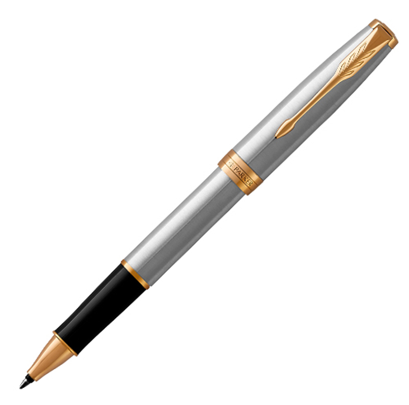 Ручка-роллер Parker ESSENTIAL Sonnet Stainless Steel GT. Цвет письма-черный, линия письма – тонкая, в подарочной упаковке
