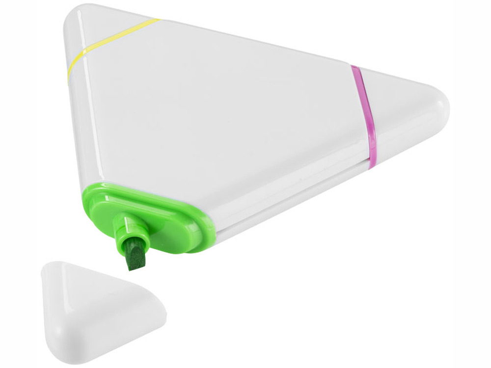 Треугольный маркер с плоским наконечником желтого, розового и зеленого цвета.