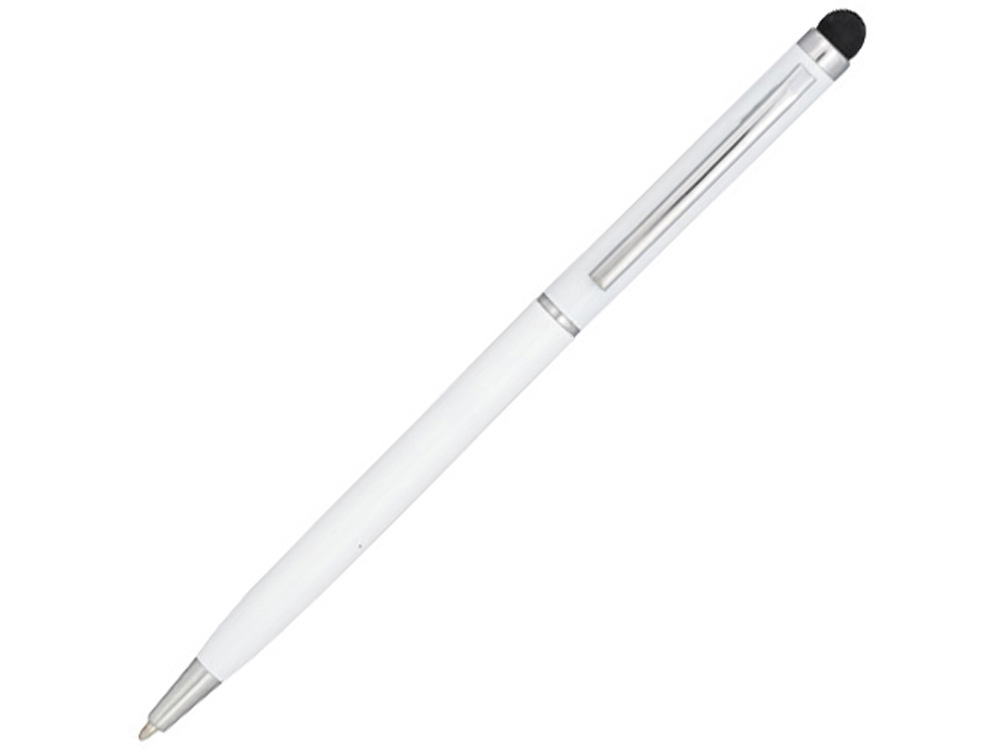 Алюминиевая шариковая ручка Joyce. Тонкая алюминиевая шариковая ручка с поворотным механизмом и стилусом. Алюминиевый корпус с металлическим зажимом и кольцом посередине, остальные элементы из пластика.