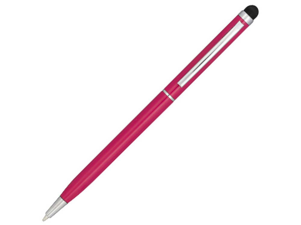 Алюминиевая шариковая ручка Joyce. Тонкая алюминиевая шариковая ручка с поворотным механизмом и стилусом. Алюминиевый корпус с металлическим зажимом и кольцом посередине, остальные элементы из пластика.