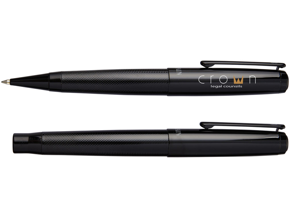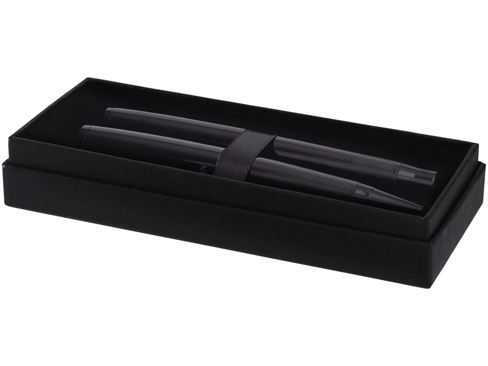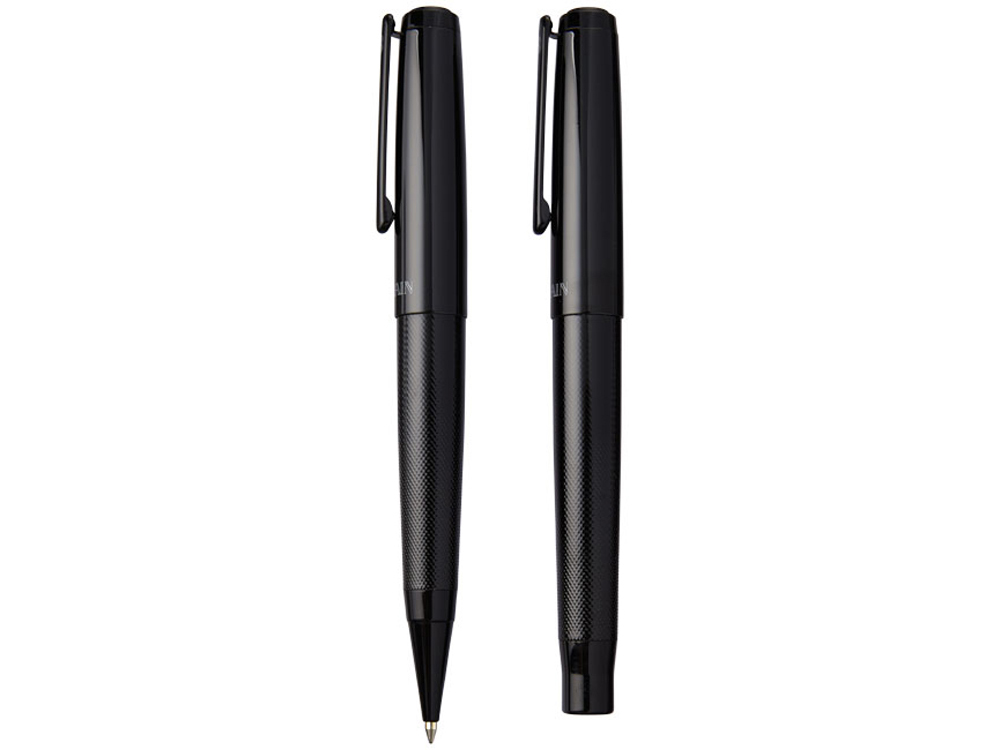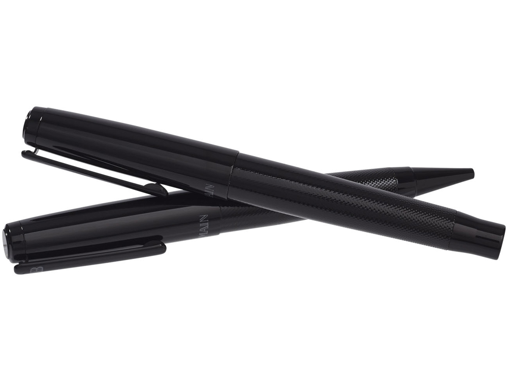 Подарочный набор ручек Gloss Duo. Подарочный набор в эксклюзивном дизайне состоит из шариковой ручки и ручки роллер. Блестящий корпус вверху и текстурная нижняя часть корпуса, блестящие акценты. В комплекте качественный стержень черного цвета. Набор упакован в подарочную коробку Balmain®. Металл.