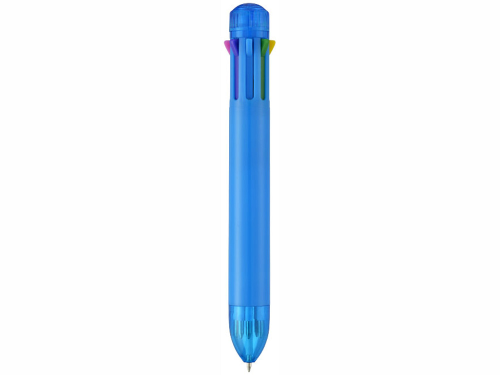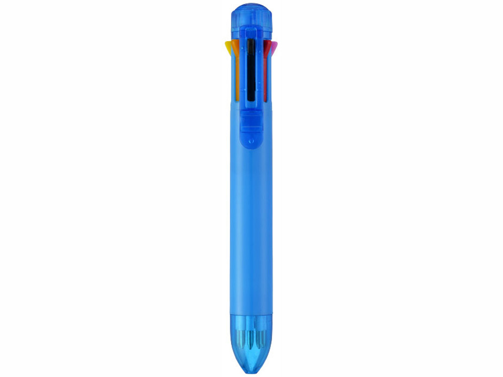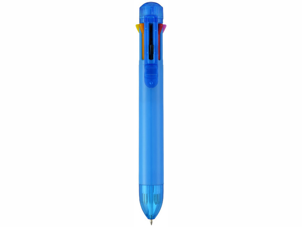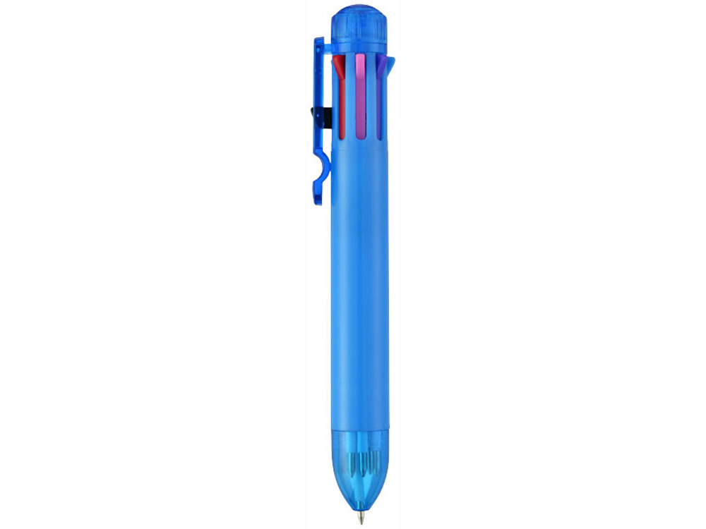 Многостержневая шариковая ручка с кнопочным механизмом и стержнями 8 различных цветов: черным, синим, зеленым, оранжевым, розовым, фиолетовым, красным и желтым.