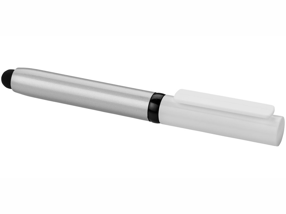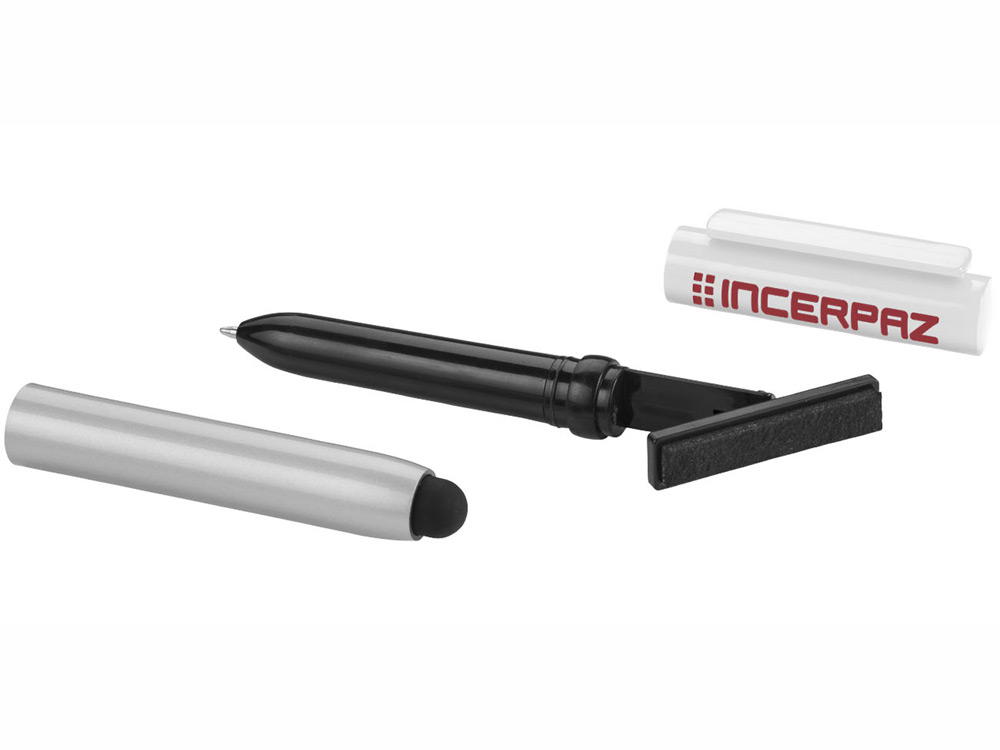 Ручка-стилус со съемным колпачком и складным очистителем экрана в форме бритвы.