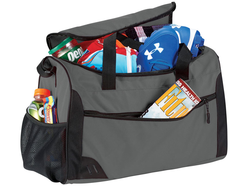Сумка Rush без ПВХ 17". Идеальная сумка для путешествий с уплотненным дном. Большое U-образное основное отделение на молнии. Большой карман спереди и боковой карман для аксессуаров. Регулируемый ремень на плечо. Без ПВХ. 600d полиэстер.