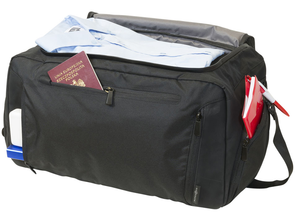 Сумка Deluxe с карманом для планшета. Эксклюзивный дизайн от Marksman позволит вам стильно путешествовать и держать все нужные вещи под рукой. Карман на молнии для планшета. Передний органайзер на молнии позволит упаковать кабели или дополнительную одежду отдельно. Два боковых отделения на молнии, одно для обуви и второе для быстрого доступа к мелочам. Съемный ремень позволит носить сумку на плече или просто за ручку. Большое U-образное отделение для удобного доступа и два дополнительных внутренних кармана. 300d полиэстер с акцентами из ПУ винила.