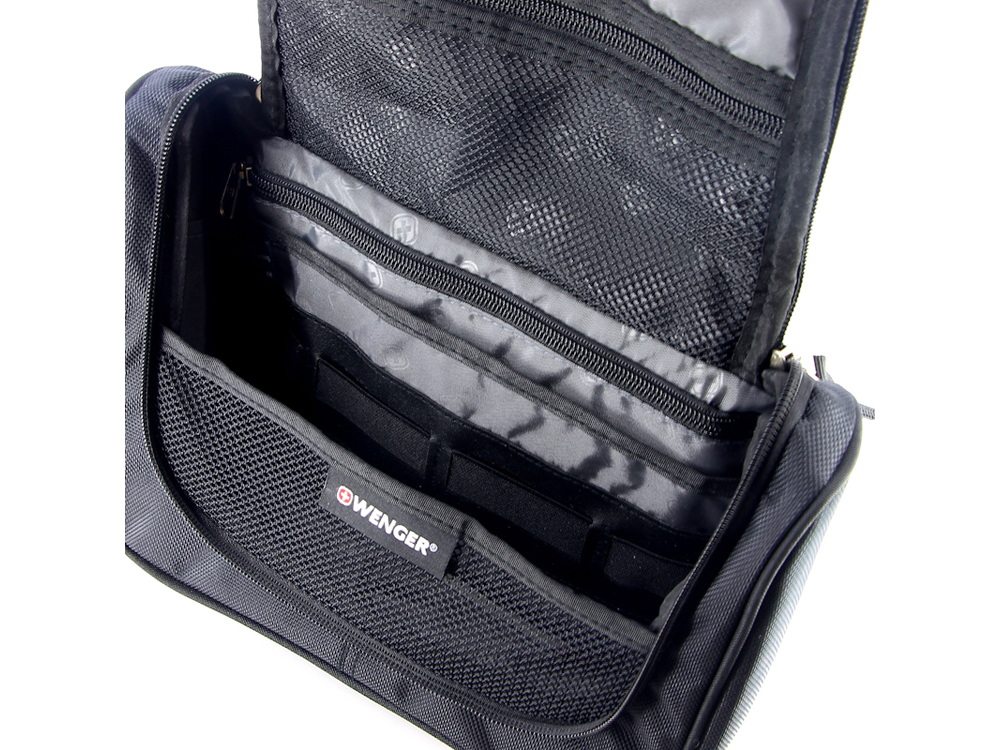 Несессер включает в себя: -основное отделение на молнии включает в себя: карман на молнии, сетчатый карман на молнии, два открытых кармана, четыре эластичных держателя для емкостей, два боковых кармашка и крючок для подвеса, - ручка для переноски.