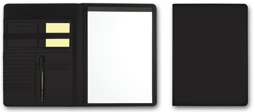 Папка формата A4 . Кармашек для визиток. Кармашек для ручек. Модульный футляр для кредиток. Бумажный блок, желтый, 50 листов. Бумажный блок, белый, 80г, 40 листов. Ручка Dart Clear черного цвета. Материал: эластичный и прочный винил.