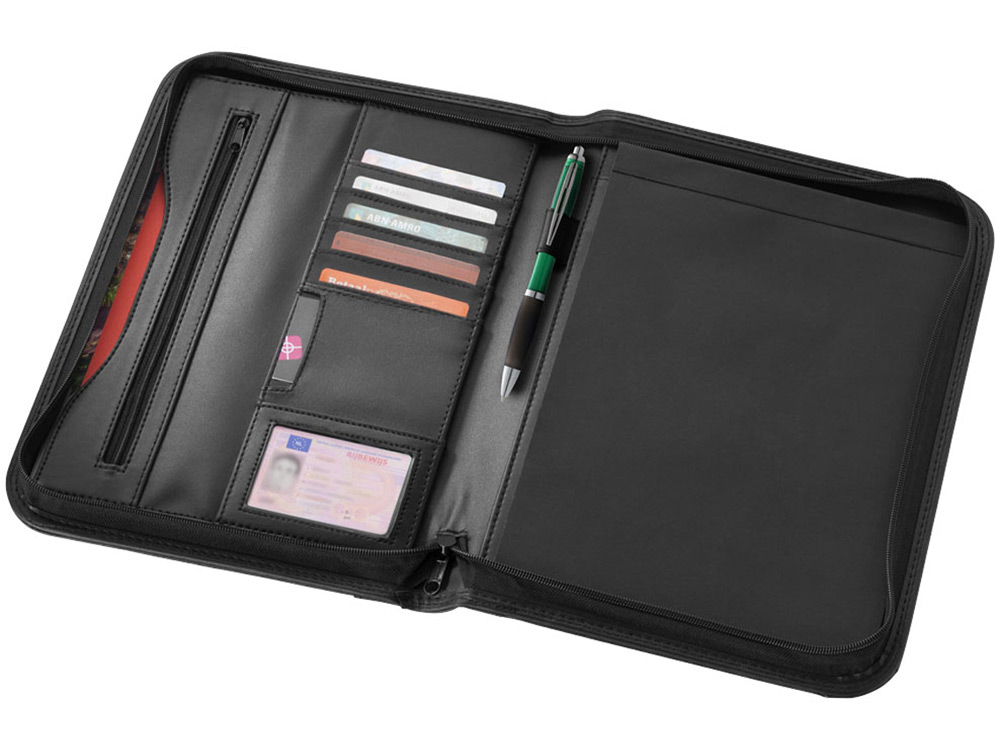 Папка с застежкой-молнией, держателем для ручки, карманом на молнии, отделениями для документов и блокнотом с 20 страницами линованной бумаги. Ручка и принадлежности не включены.