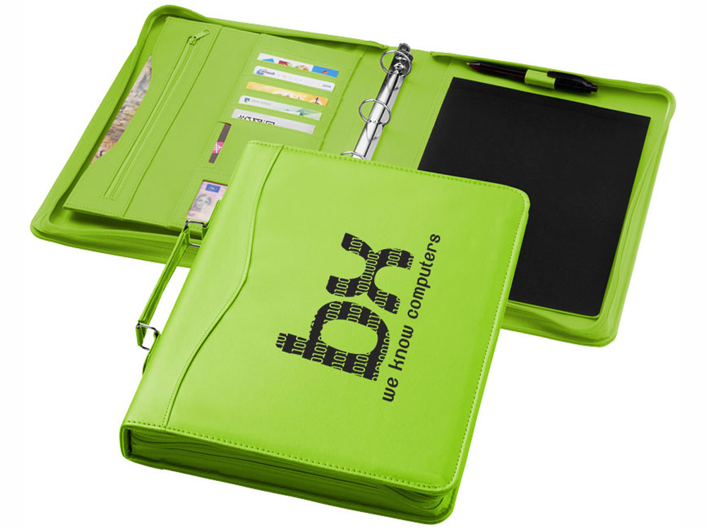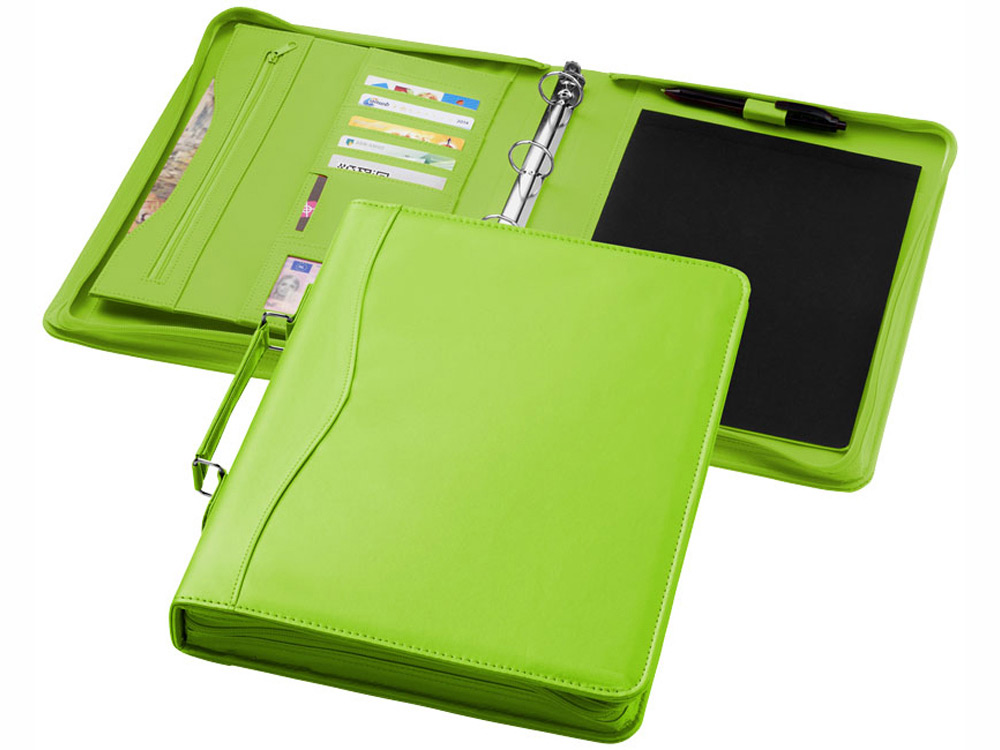 Удобная деловая папка с блокнотом А4. Встроенный скоросшиватель на кольцах позволяет закрепить нужные документы в пластиковых файлах. Папка застегивается на молнию. Удобная ручка, несколько карманов для дисконтных карт и визиток, карман на молнии. Выполнена из качественного кожзаменителя.