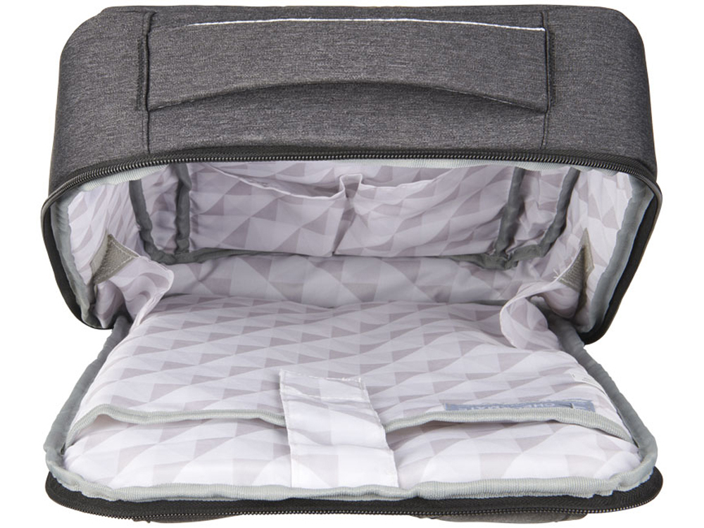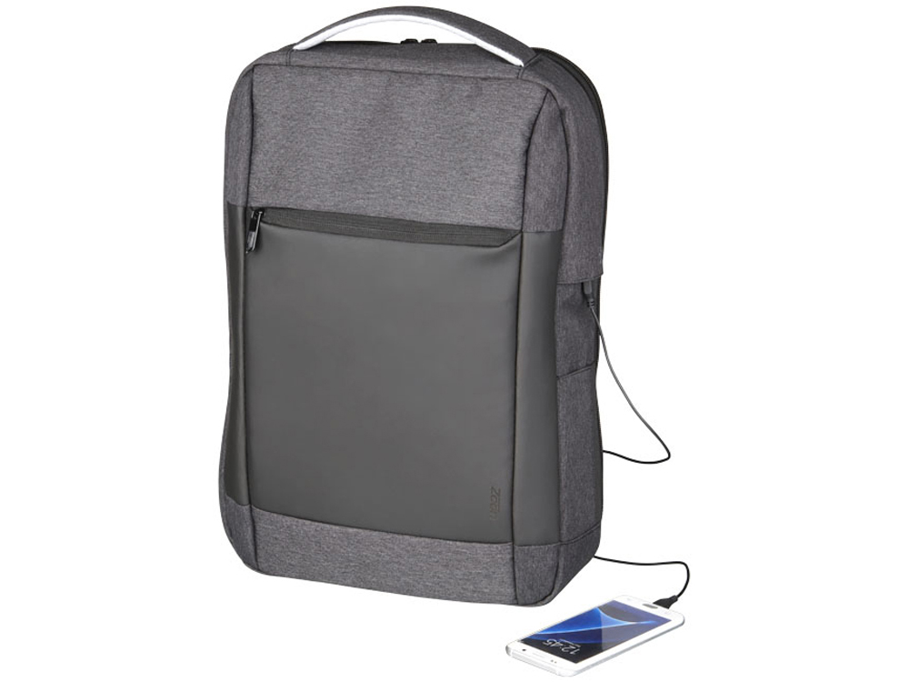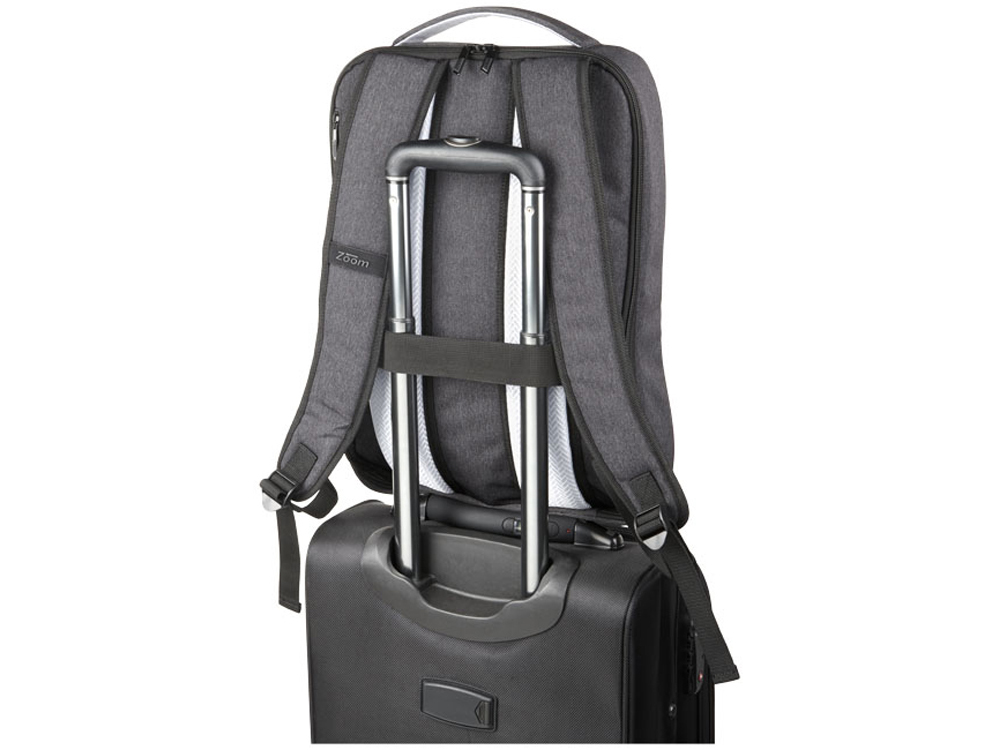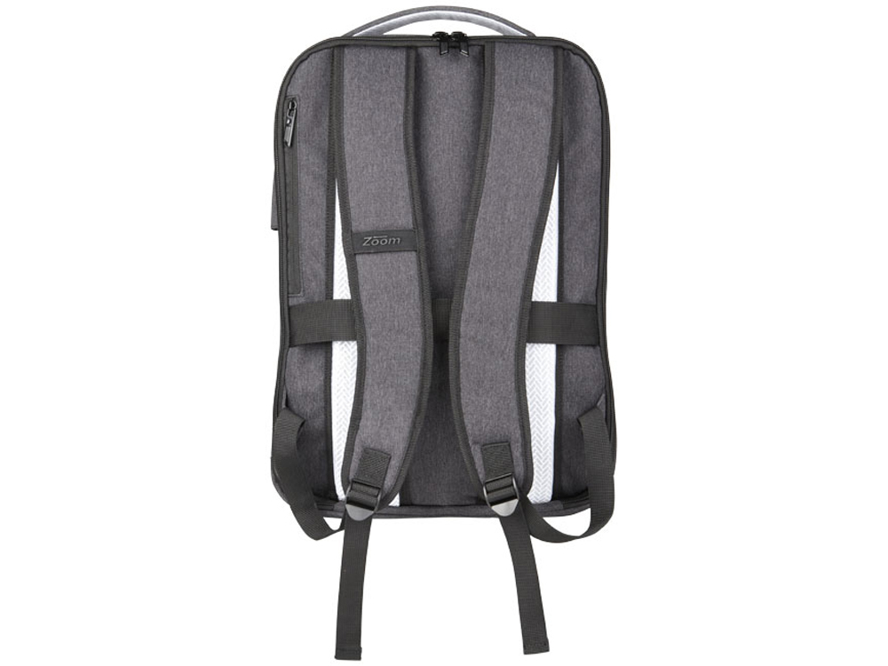 Изящный компьютерный рюкзак с противоударной защитой Zoom 15". Гладкий рюкзак 15 дюймов для ноутбука с разъемом USB и кабелем, организатором кабелей и удобным чехлом для ноутбука (соответствует требованиям Управления по безопасности перевозок). Также в комплект включен сетчатый чехол для тележки. Сделано из 900D полиэстера. 600D полиэстер с виниловыми вставками.