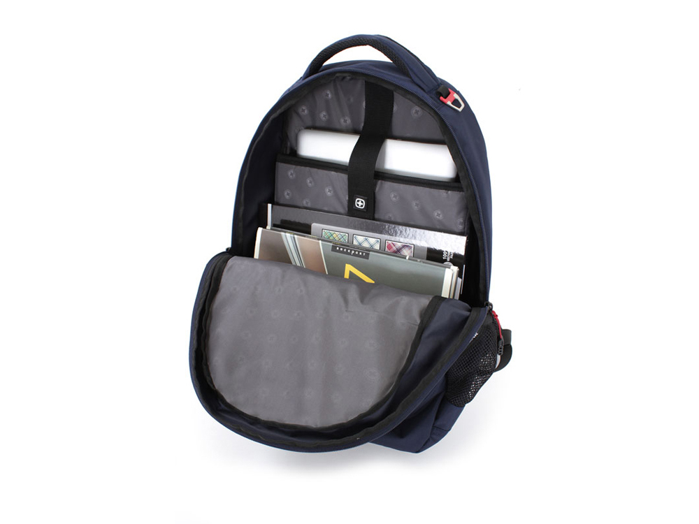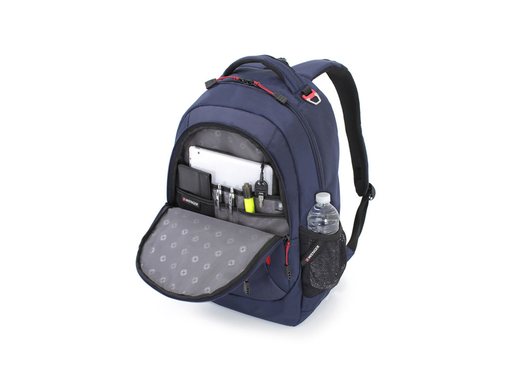 Рюкзак включает в себя: -отделение с мягкими стенками для ноутбука с диагональю экрана 15”, -карман-органайзер для мелких вещей с отделением для телефона, пишущих принадлежностей, ключей и пр., -карман для быстрого доступа, -два боковых кармана для бутылок или зонта выполненные из специальной двойной эластичной сетки, -спинка рюкзака имеет специальную рельефно-анатомическую поверхность и оснащена системой циркуляции воздуха AirFlow, -ручка и ручка с мягкими вставками предназначены для удобства переноски, -регулируемые эластичные плечевые ремни анатомической формы с пропускающей воздух подкладкой и с петлей для очков.