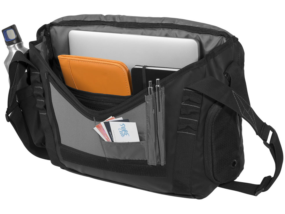 Сумка Lift для ноутбука 15,6". Сумка для ноутбука до 15,6". Просторное основное отделение. Карман для планшета, кабелей, ручек, повербанка и карт. Так же снаружи есть петельки для крепления дополнительных мелочей, как например, велосипедный фонарь. Большой карман для бутылки с водой и внешний карман на молнии сбоку. Уплотненный ремень на плечо. Стропа для крепления к чемодану. Дно из тарпаулина и водонепроницаемые молнии делают сумку особо прочной и устойчивой к осадкам. Полиэстер с покрытием ПУ, рипстоп полиэстер и тарпаулин.