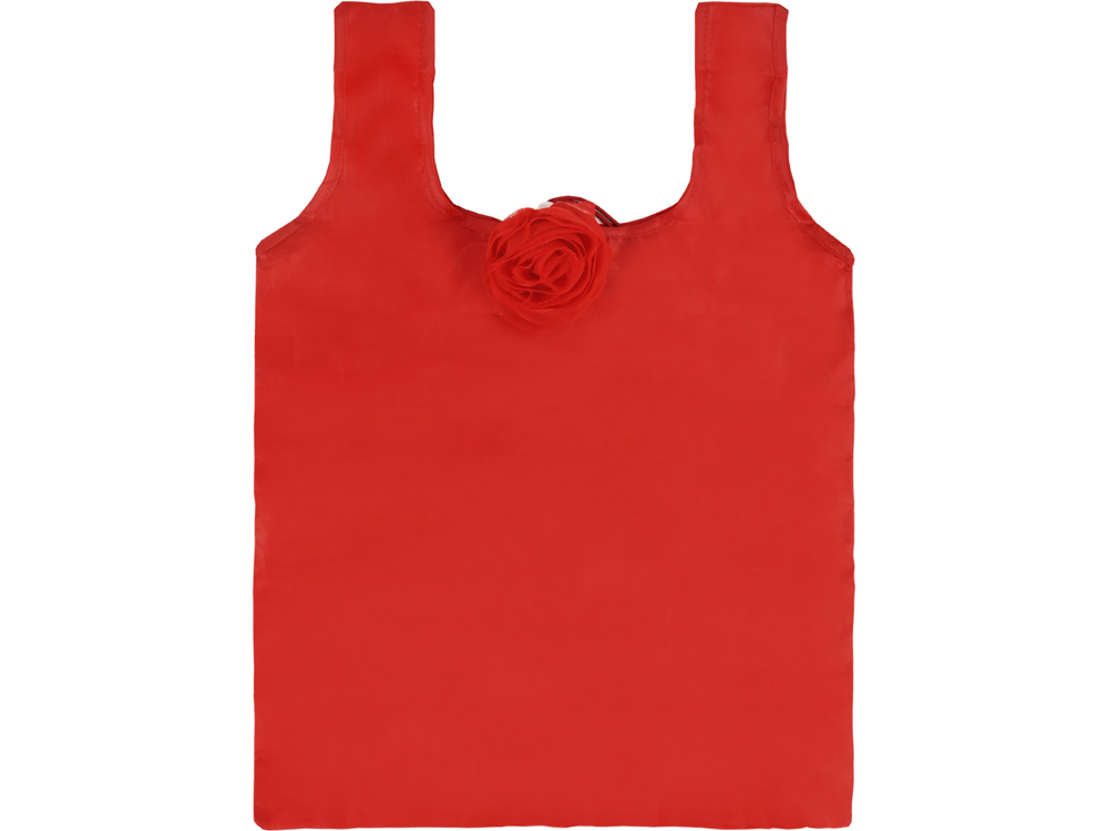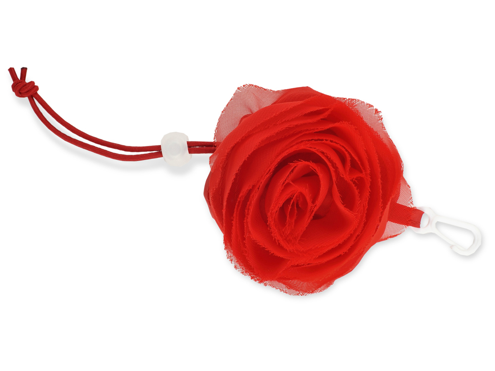 Стильная женская сумка для шопинга из мягкого полиэстера декорирована тканевой розой, которая также играет роль чехла, в который складывается сумка. Сумка очень вместительная, затягивается на резинке с карабином.
